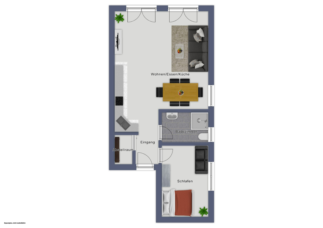 Das Schlafzimmer liegt ruhig und bietet ausreichend Platz für Bett und Kleiderschrank. Das zentral gelegene Badezimmer ist funktional ausgestattet. Ein separater Abstellraum im Eingangsbereich sorgt für zusätzlichen Stauraum.