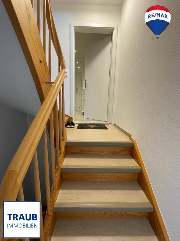 Vom geräumigen Wohnzimmer aus, welches sich ideal für gemütliche Abende oder geselliges Beisammensein eignet und mit seinem Zugang zum Balkon eine luftige und offene Note schafft, gelangen Sie über eine Treppe in die Räume des Dachgeschosses.
