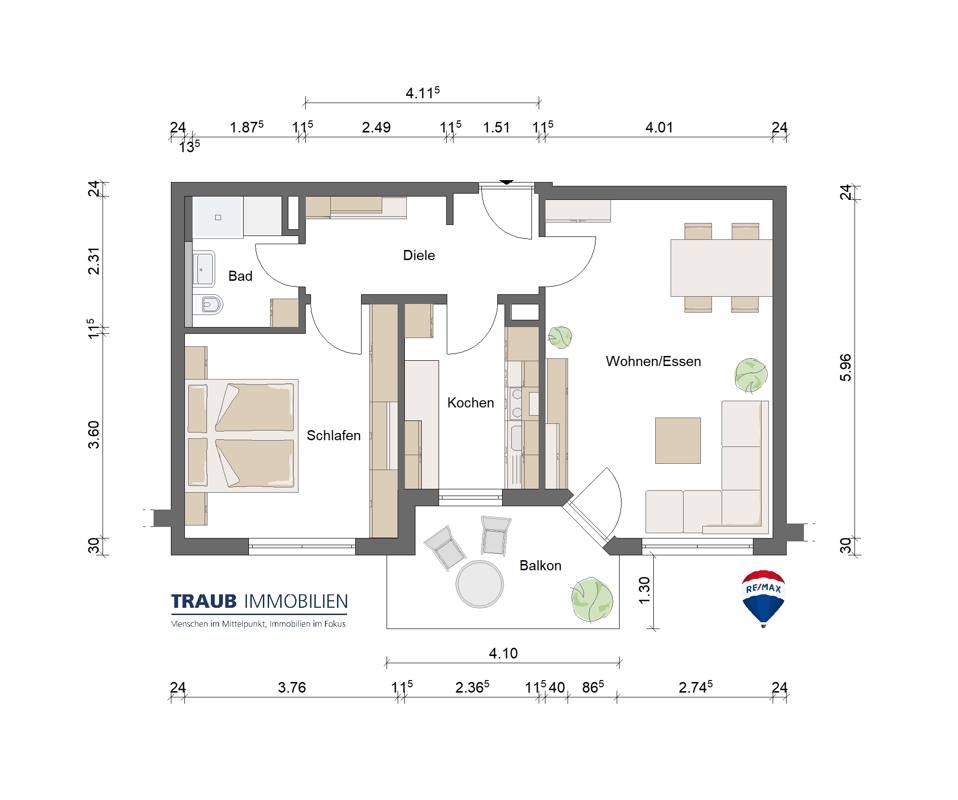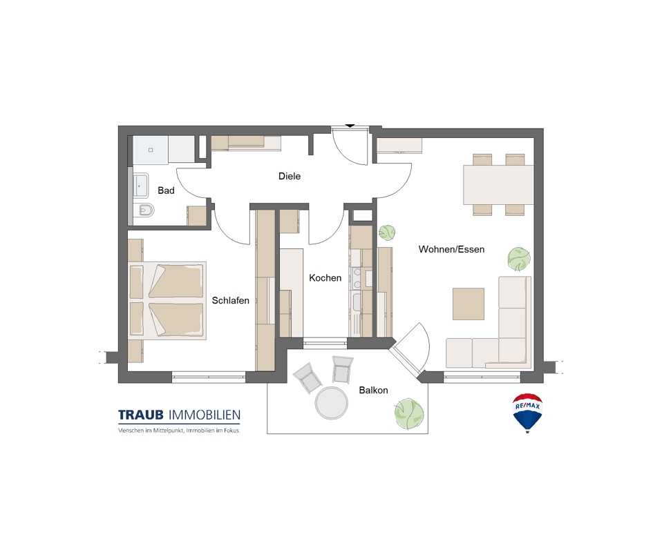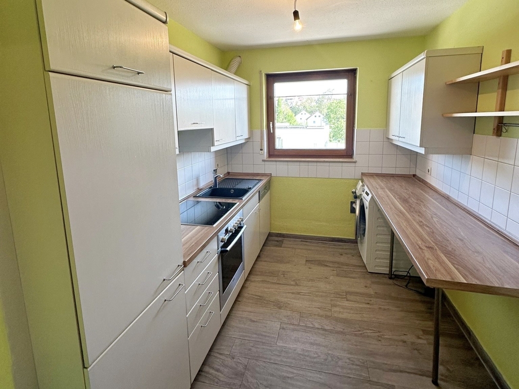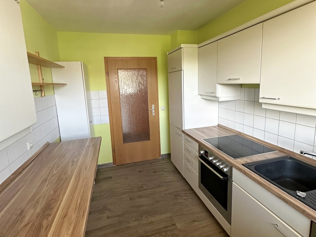 Der helle Wohn- und Essbereich ist geräumig und einladend – der perfekte Ort für gemütliche Abende mit Familie und Freunden. Von hier aus haben Sie Zugang zum Balkon, der ideal ist, um sich vom Alltagsstress zu erholen. Mit herrlichem Blick ins Grüne und optimaler Süd-Ausrichtung, lädt er zu entspannten Stunden in der Sonne ein. Die separate Küche ist in einem guten Zustand und bietet genügend Platz für Ihre Kochutensilien.