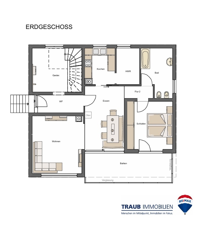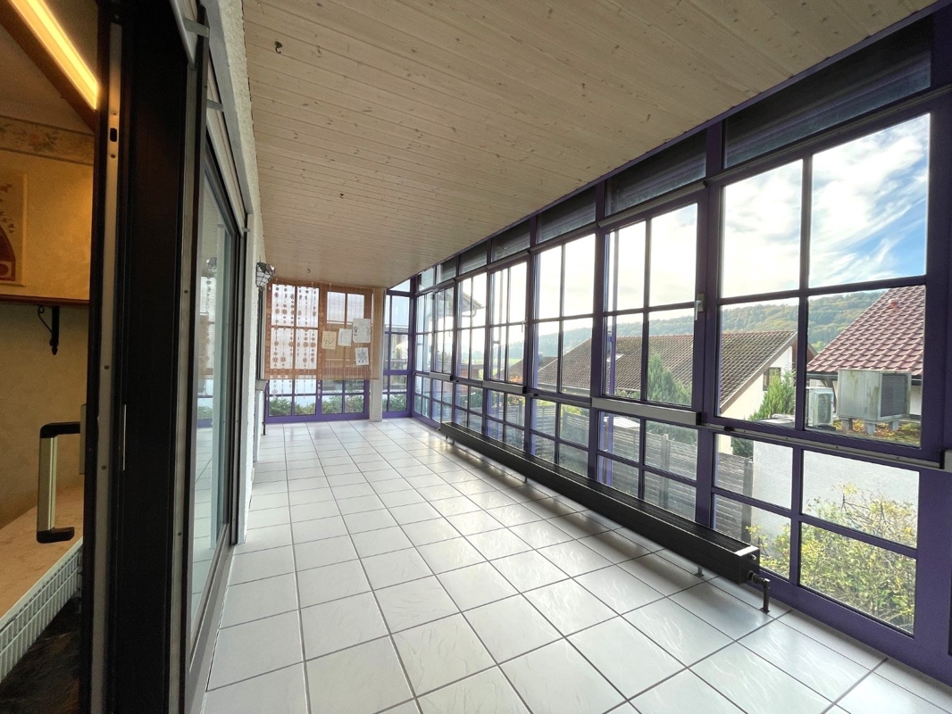 Wintergarten: Vom Esszimmer aus gelangen Sie auf den ehemals offenen Balkon, der inzwischen vollständig verglast wurde. Dadurch lässt sich dieser Bereich das ganze Jahr über nutzen – egal, ob als sonniges Lesezimmer oder als weiterer Essbereich mit Blick in den Garten.