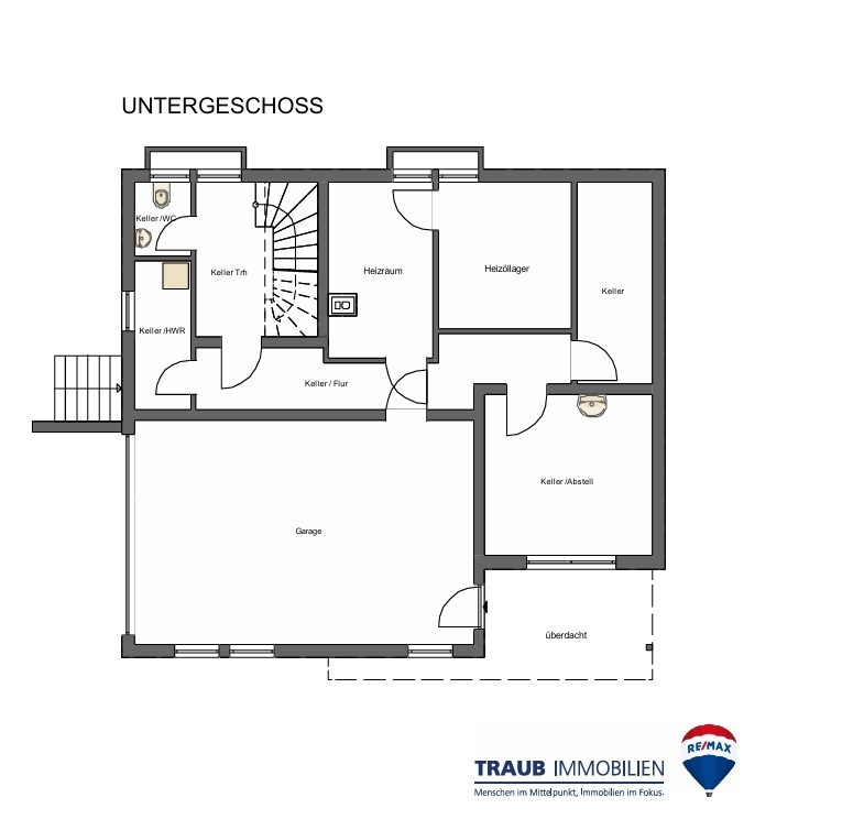 Der Keller bietet einen vielseitig nutzbaren Hobbyraum mit Waschbecken, der sich auch als Gästebereich eignet. Außerdem ist hier eine geflieste Doppelgarage mit direktem Zugang zum Haus untergebracht – praktisch und komfortabel.