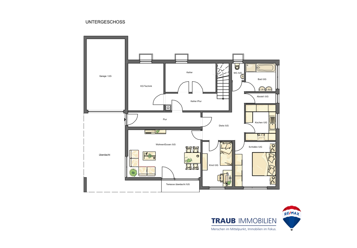 Die untere 3-Zimmer-Wohnung ist bereits vermietet und bietet eine sichere Einnahmequelle. Genießen sie hier die schöne Südterrasse. Mit einer eigenen Garage ist diese Einheit besonders attraktiv für Mieter, die Wert auf Komfort und Sicherheit legen.