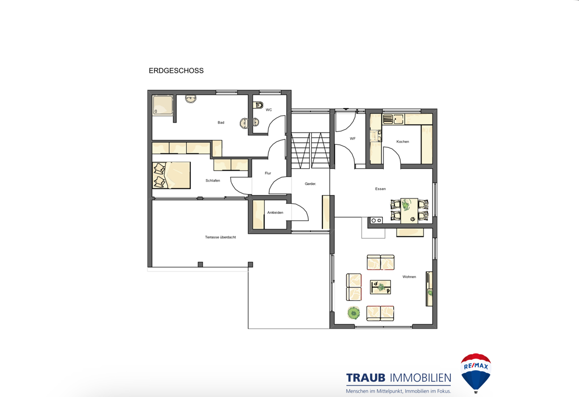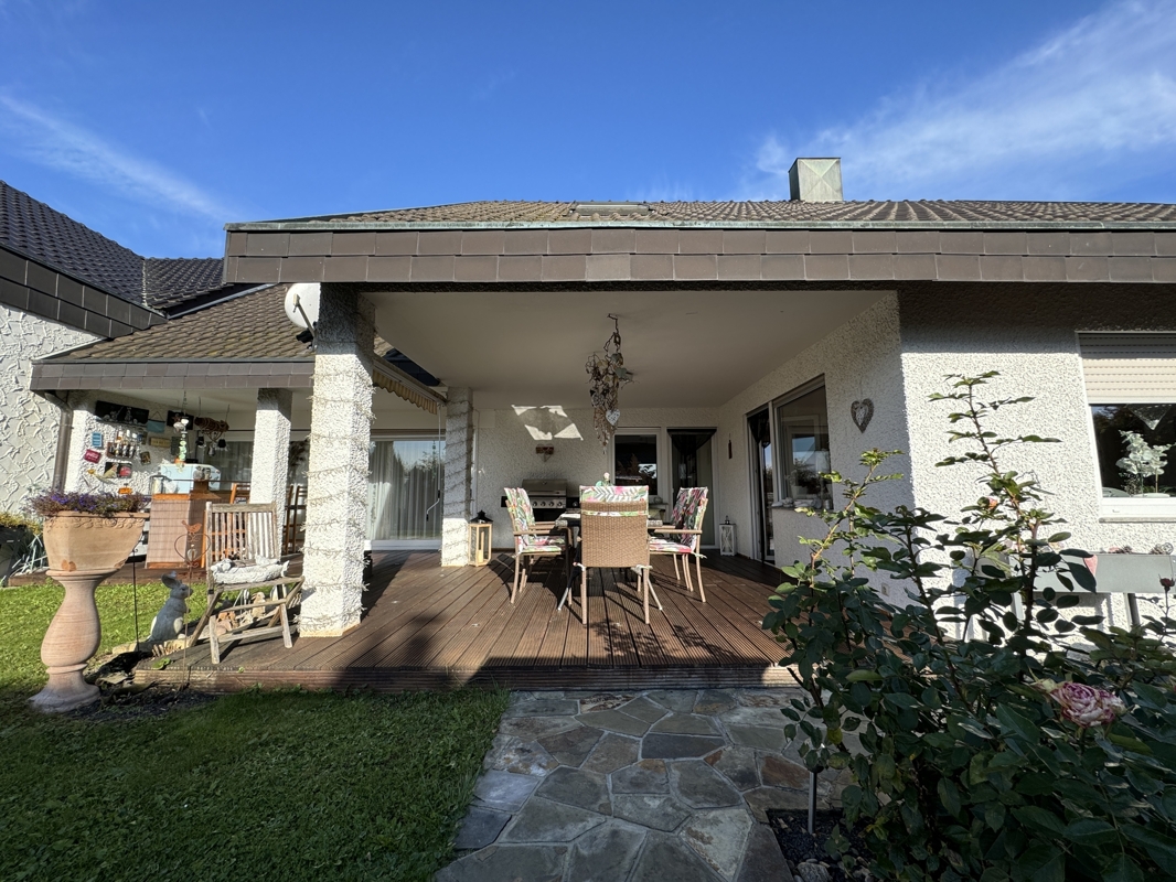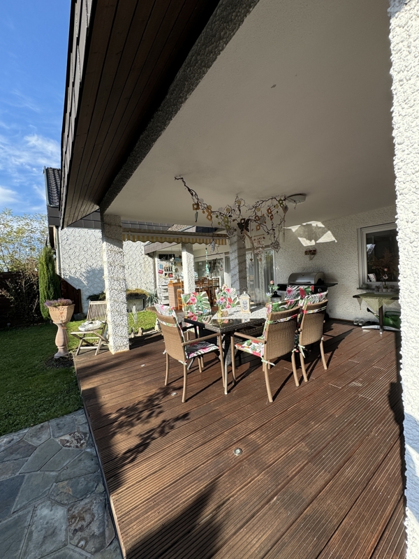 - Große überdachte Terrasse: Genießen Sie entspannte Stunden im Freien, unabhängig von Wetterbedingungen