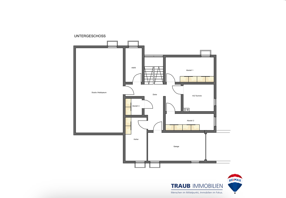 Über das offene Treppenhaus gelangen Sie auch in den Keller. Hier befinden sich drei Kellerräume, zwei Heizräume sowie eine Waschküche und ein Hobbyraum. Ebenso haben Sie hier direkten Zugang zur Garage, die mit einem elektrischen Garagentor ausgestattet ist.