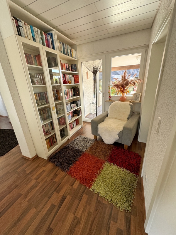 Eine gemütliche Leseecke mit Zugang zur Terrasse und anschließendem Ankleidezimmer befindet sich vor dem Schlafzimmer. Auch vom Schlafzimmer aus gelangen Sie auf die Terrasse. Ein weiteres Highlight ist das großzügige Tageslichtbad mit ebenerdiger Dusche und zwei Waschbecken. Das separate WC mit Fenster bietet weiteren Komfort.