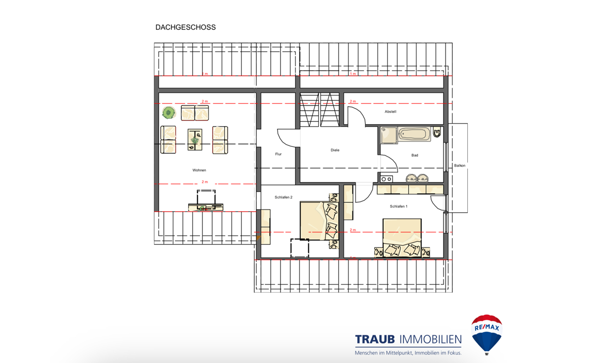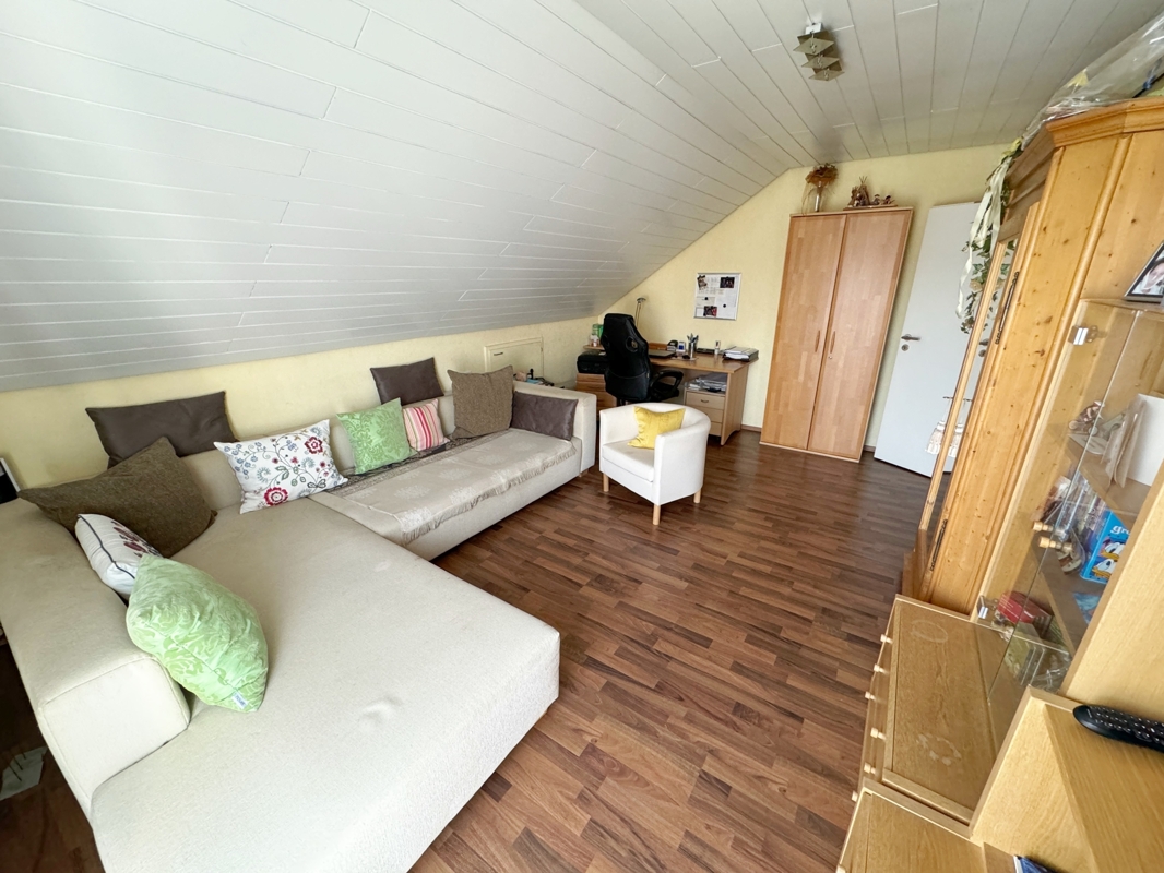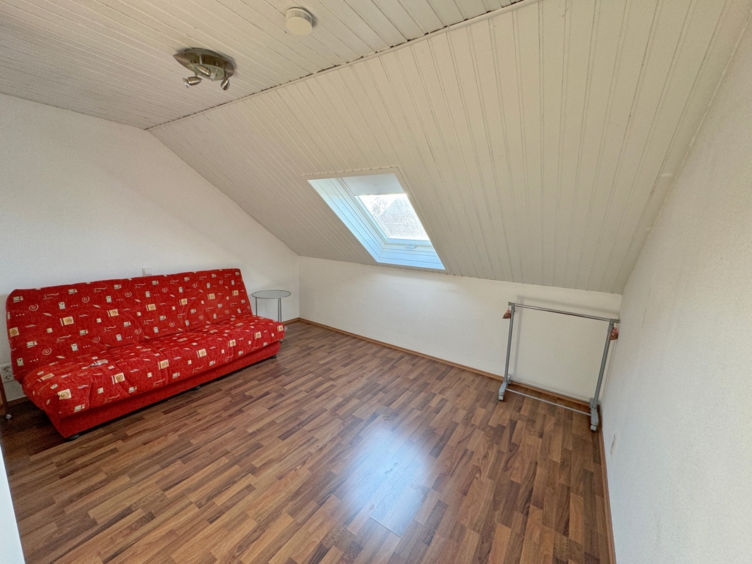 Über das Treppenhaus gelangen Sie ins DG. Hier befinden sich drei Zimmer, die Sie nach Ihrem Bedarf nutzen und gestalten können. Ein Bad mit Dusche, WC und Badewanne steht Ihnen hier zur Verfügung.