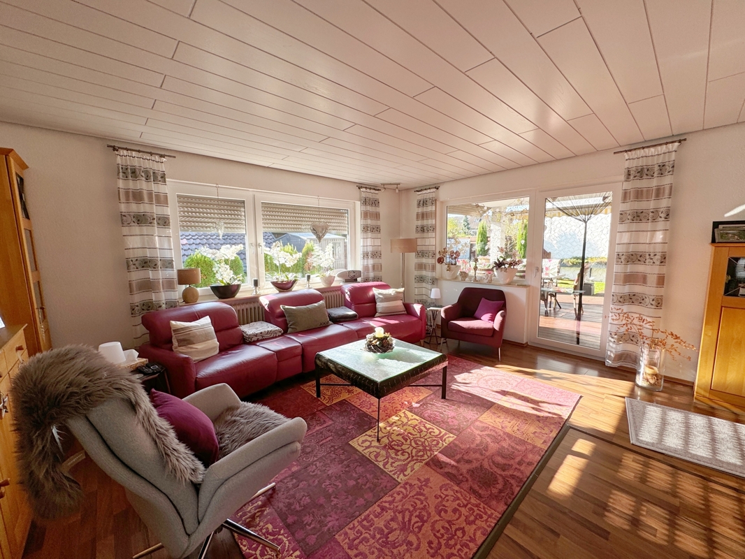 Das helle Wohnzimmer mit offenem Kamin lädt zum gemütlichen Verweilen ein. Von hier aus gelangen Sie auf die