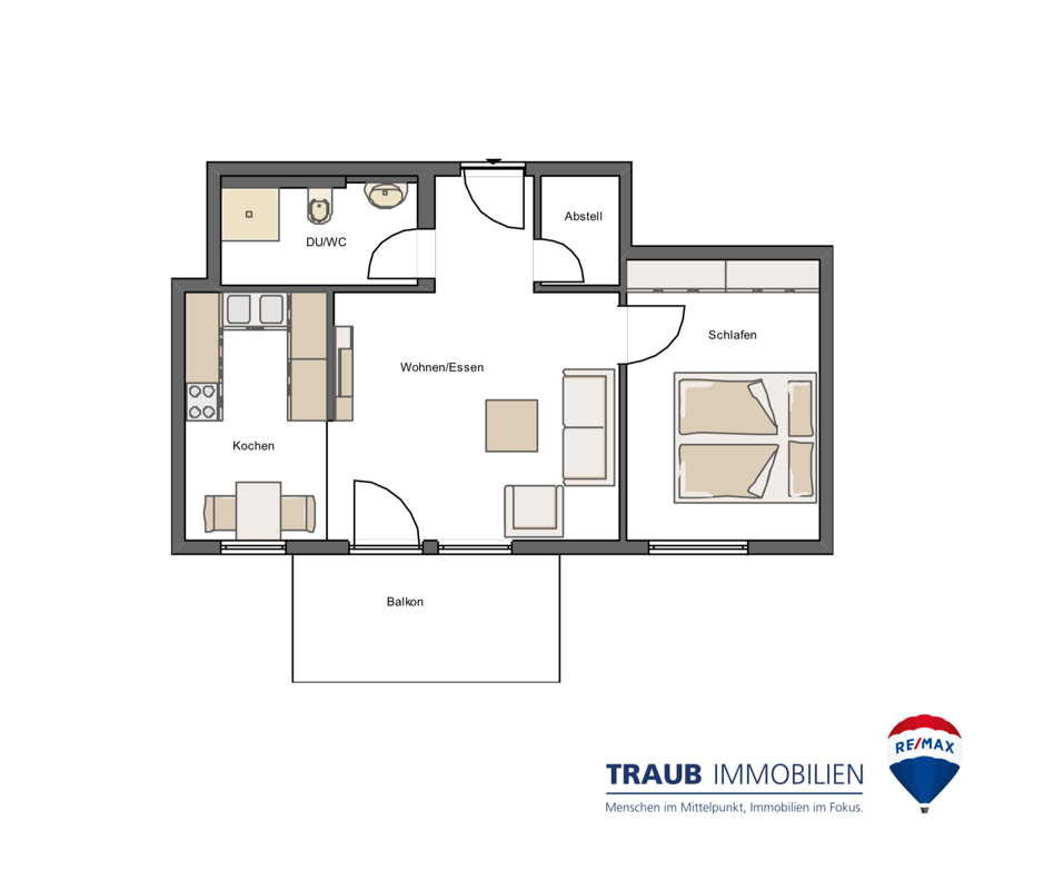 - Zimmer: 2 1/2 (Wohn-Esszimmer, Schlafzimmer, Abstellraum)