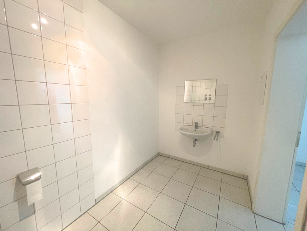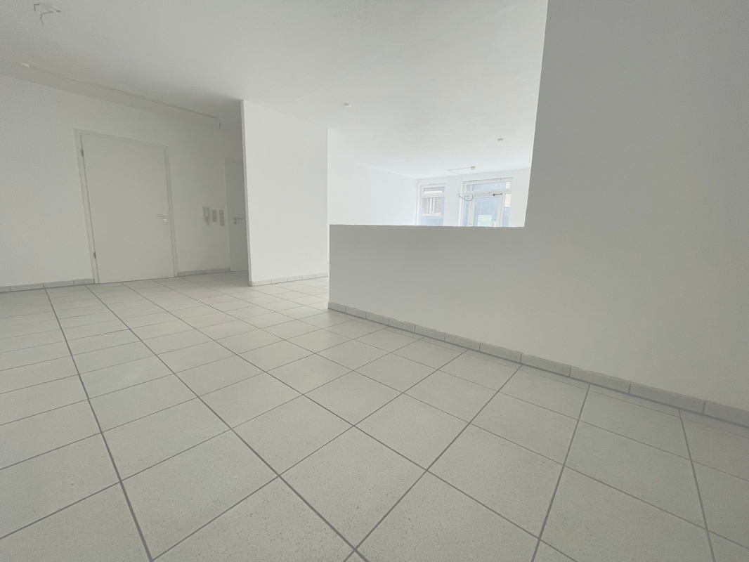 Die Gewerbefläche ist derzeit. anders als auf dem Grundriss zu erkennen, durch eine halbhohe Wand unterteilt, was verschiedene Nutzungsmöglichkeiten eröffnet; ideal beispielsweise als Ladenfläche, Showroom oder Büro.
