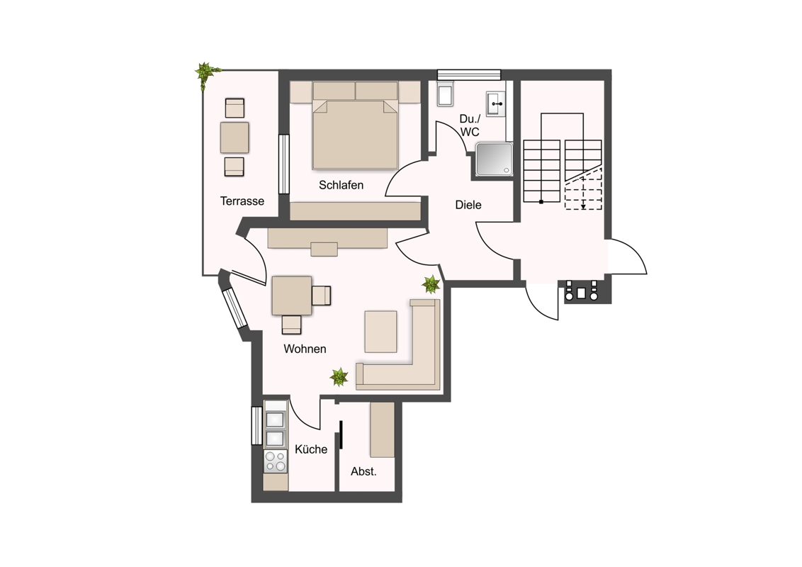 - 2 Zimmer (großer Wohn- & Essbereich, 1 Schlafzimmer, 1 Badezimmer, 1 Küche mit Abstellraum)