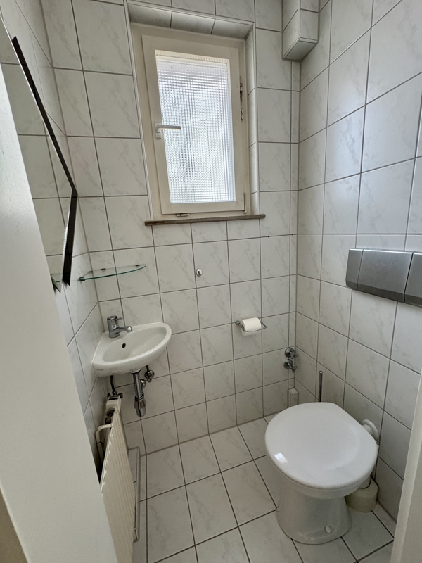 Über den Eingangsbereich gelangen Sie in die Räume des Erdgeschosses. Auf dieser Ebene befinden sich ein separates Gäste-WC sowie ein Tageslichtbad mit Badewanne und Handtuchheizkörper.