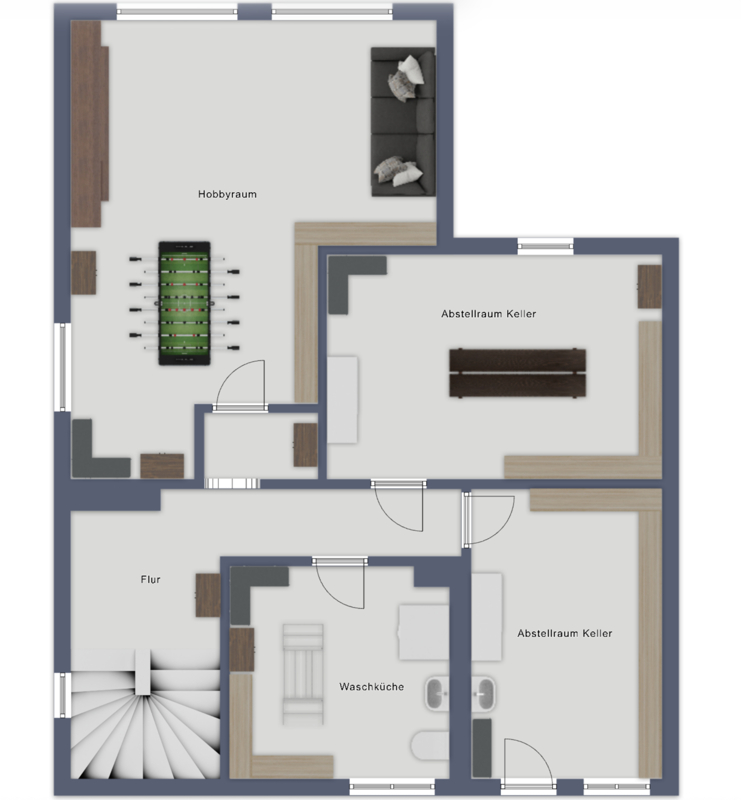 Hier befindet sich ein großer Hobbyraum, der sich ideal als Arbeitszimmer, Fitnessraum oder Freizeitbereich nutzen lässt. Im Keller befindet sich ein weiteres WC. Ergänzt wird der Keller durch drei weitere Kellerräume, die viel Stauraum bieten.