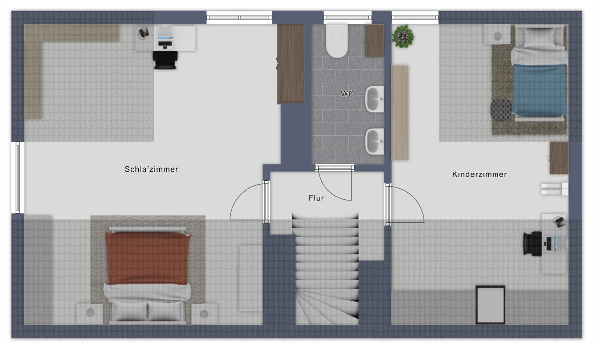 Das Dachgeschoss erweitert das Raumangebot um zwei weitere Zimmer, die sich vielseitig als Schlaf-, Gäste- oder Arbeitszimmer nutzen lassen.