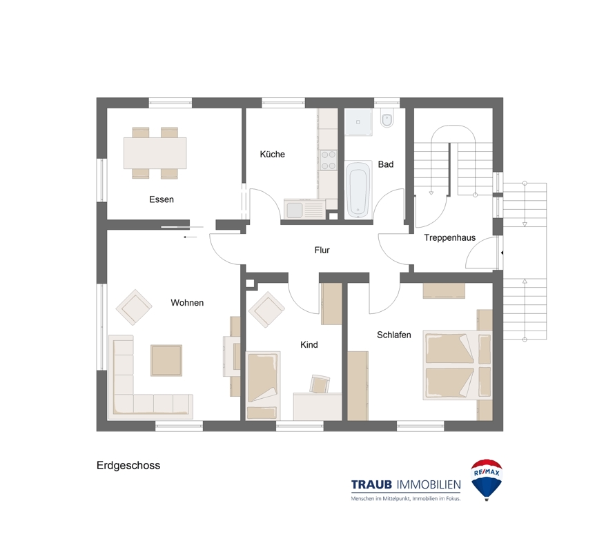 Im Erdgeschoss befinden sich 4 Zimmer, eine Küche und ein Badezimmer. Der Blick auf den großzügigen Garten verleiht diesem Stockwerk eine besondere Atmosphäre.