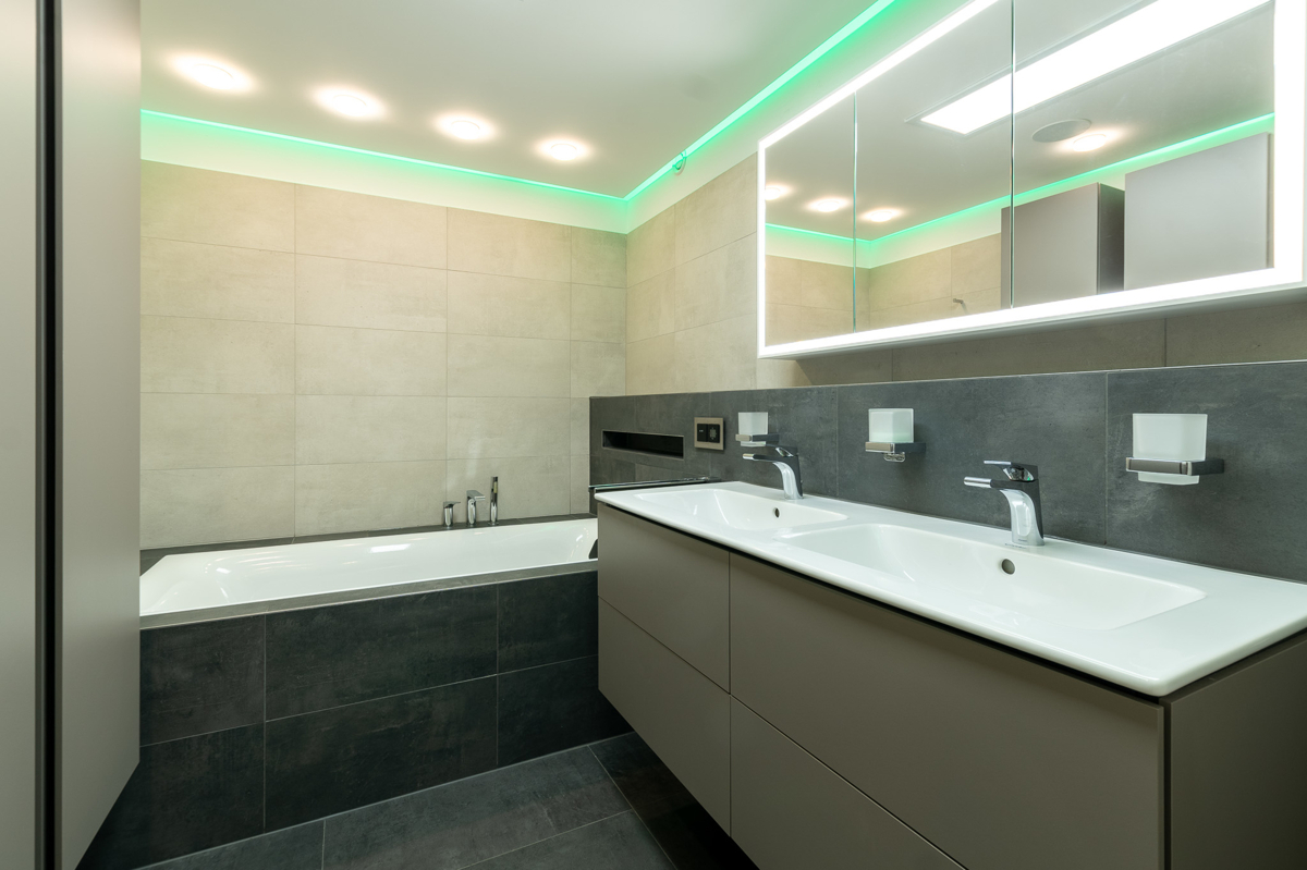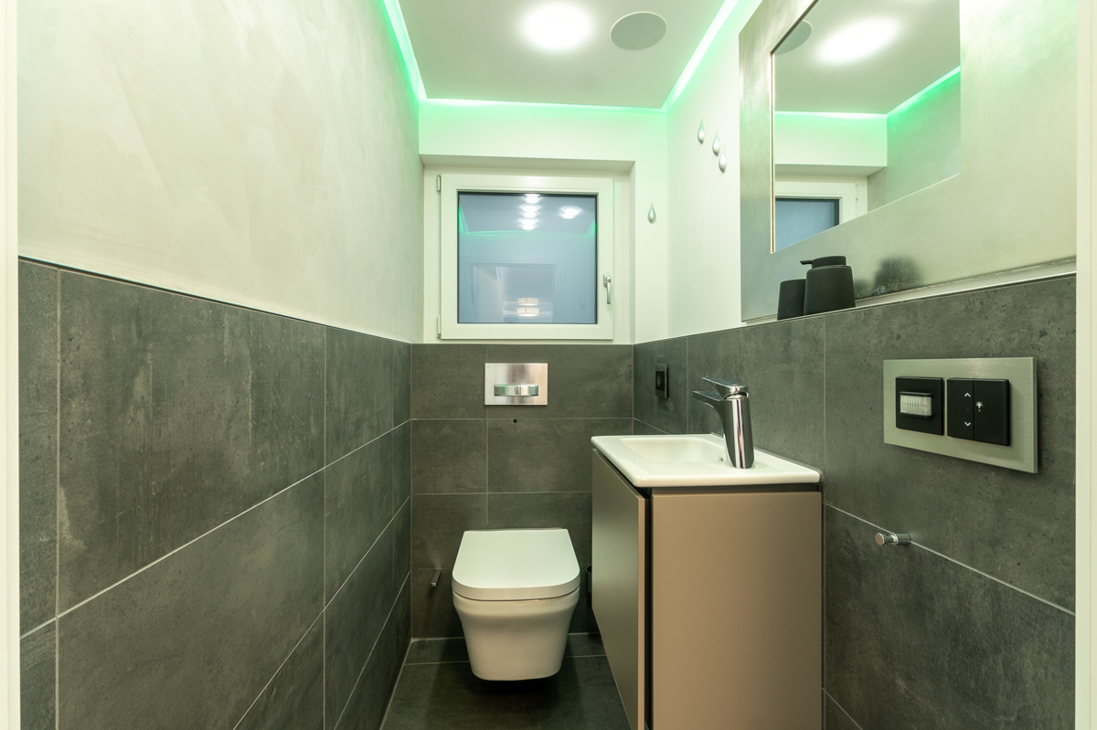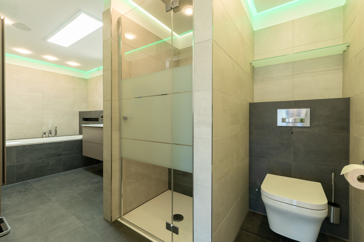 Im Badezimmer finden Sie eine Badewanne, sowie eine geräumige Dusche, die Ihnen eine entspannende Auszeit bietet. Ein separates Gäste-WC steht ebenfalls zur Verfügung, welches mehr Privatsphäre gewährt.