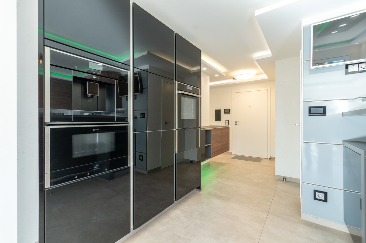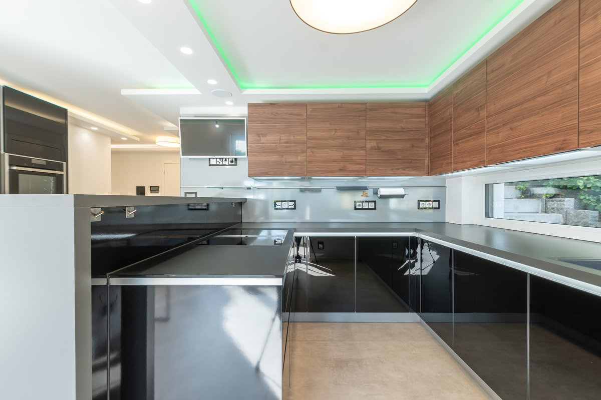 Die offene Küche ist ein echter Blickfang und mit hochwertigen Materialien ausgestattet. Sie bietet eine optimale Arbeitsfläche für kulinarische Kreationen und eine ästhetisch ansprechende Umgebung.