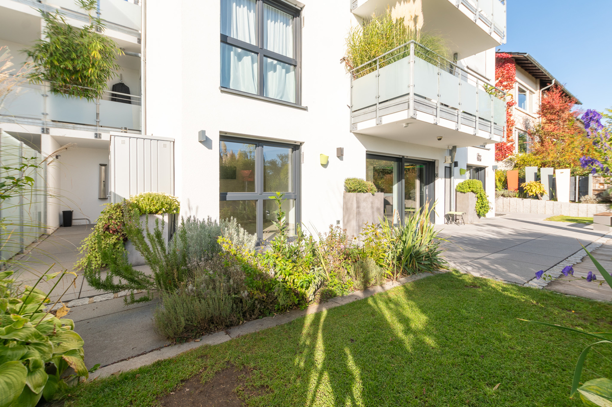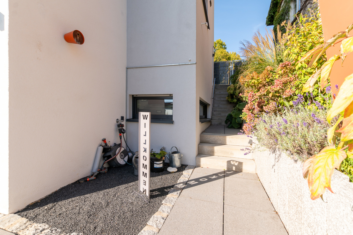 Die großzügige nach Süden ausgerichtete Terrasse ist ein perfekter Ort, um die Sonne und frische Luft zu genießen. Zusätzlich gibt es eine Edelstahlablage am Grillplatz und einen Kugelgrill, um kulinarische Köstlichkeiten im Freien zuzubereiten. Die Rasenflächen sind liebevoll angelegt und gepflegt, und es gibt diverse Obstgehölze für eine eigene kleine Ernte. Individuell gefertigte Sichtschutzwände aus mattem Glas oder lackiertem Metall sorgen für Privatsphäre und Ästhetik.